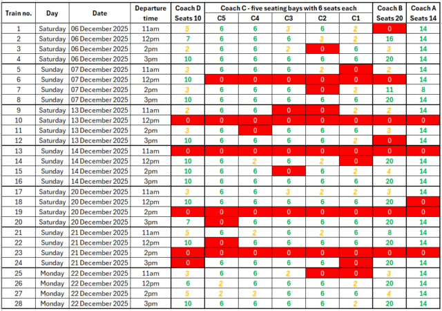 Coach A is reserved for parties requiring a wheelchair accessible coach – email admin@sklr.net to book into the coach.